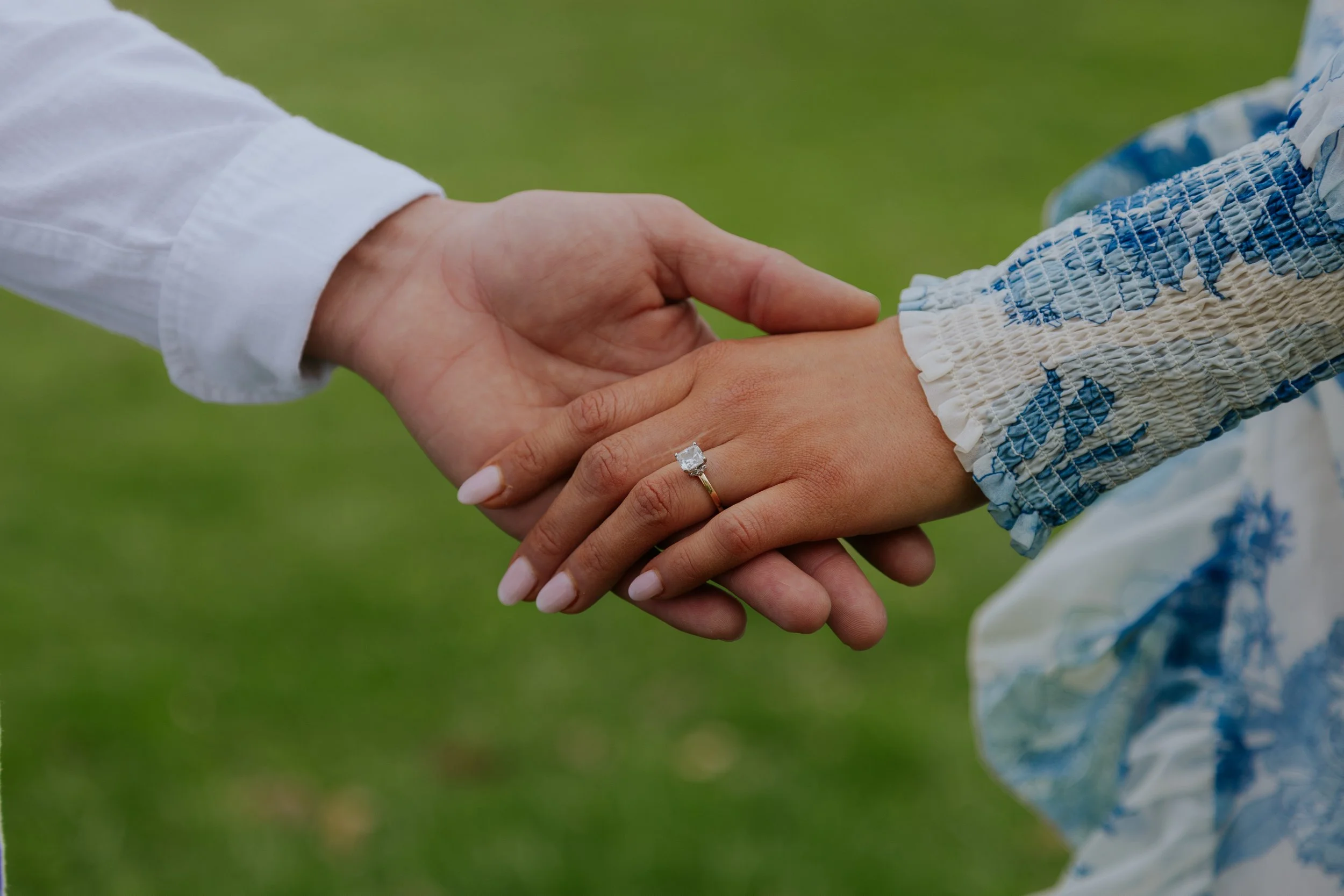 Close-up of two hands holding, one wearing an engagement ring, outdoors with green grass background.