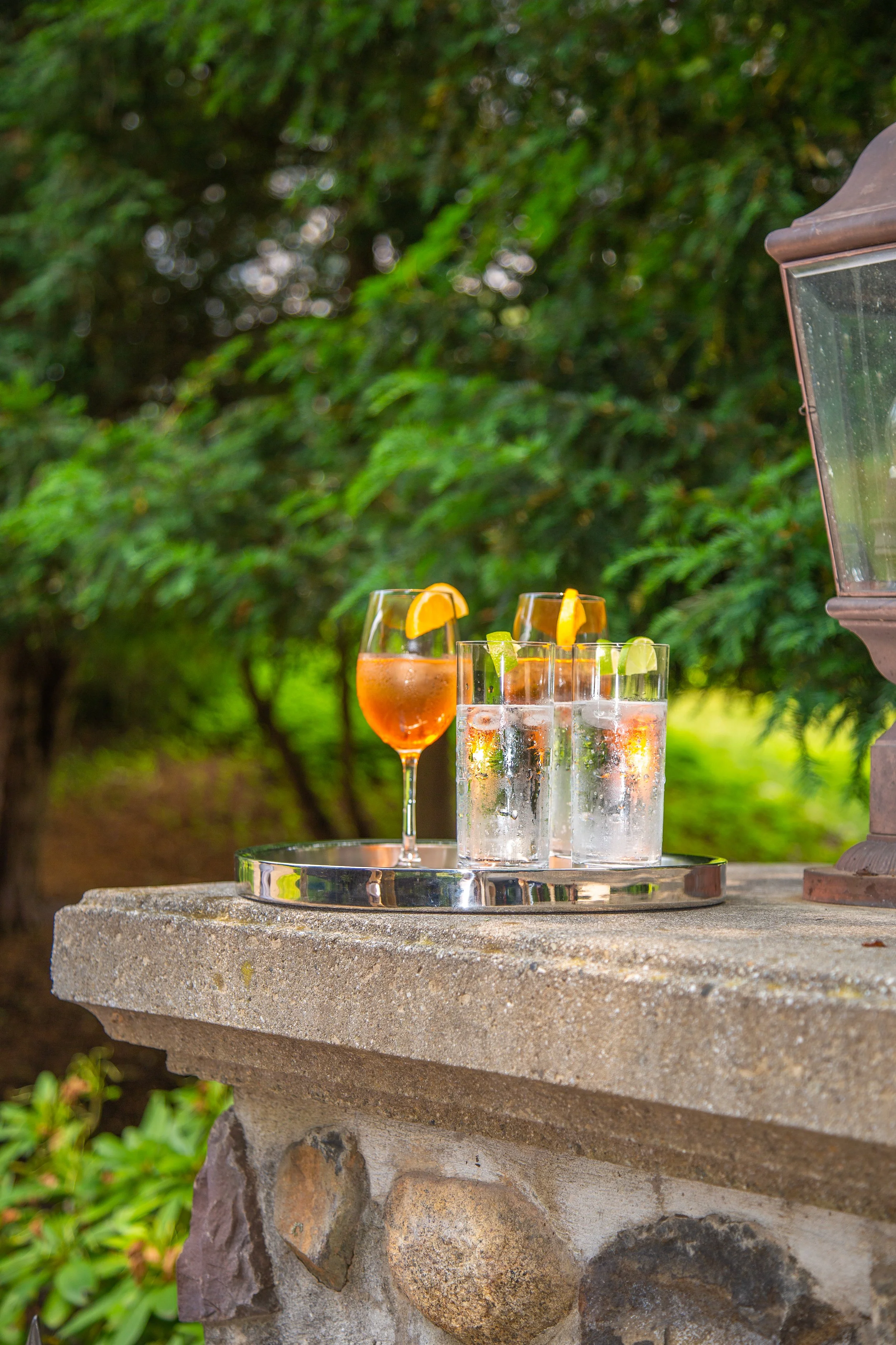 Close-up of a waiter holding a tray with four glasses of white wine outdoors, with green foliage and a white fence in the background.