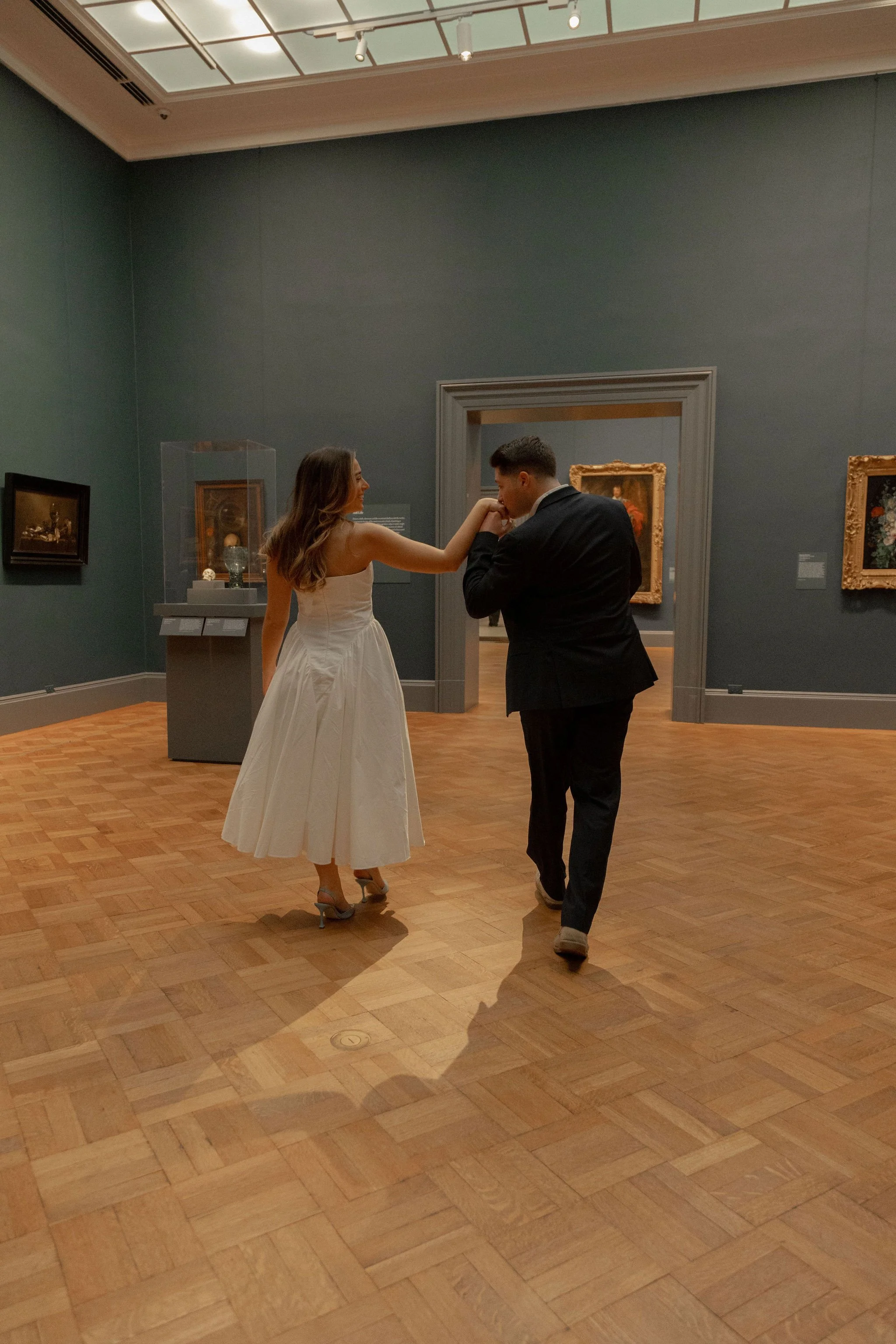 A couple walking hand in hand in an art gallery, with the woman wearing a white dress and the man in a black suit. Artworks are displayed on the walls in the background.