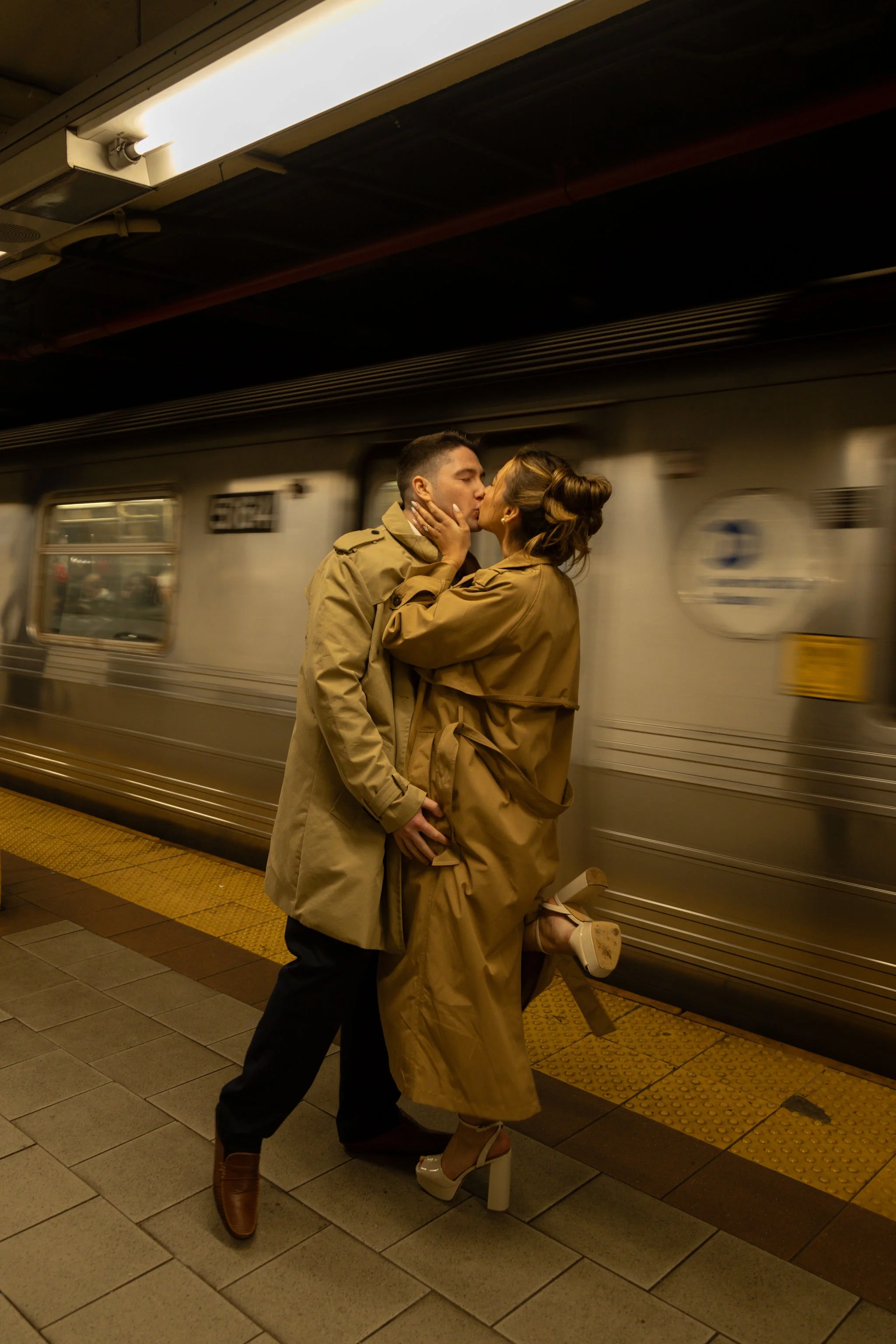 A couple walking hand in hand on a city sidewalk. The woman is wearing a white, fringed mini dress and the man is in a dark suit. Urban buildings and parked cars are in the background.