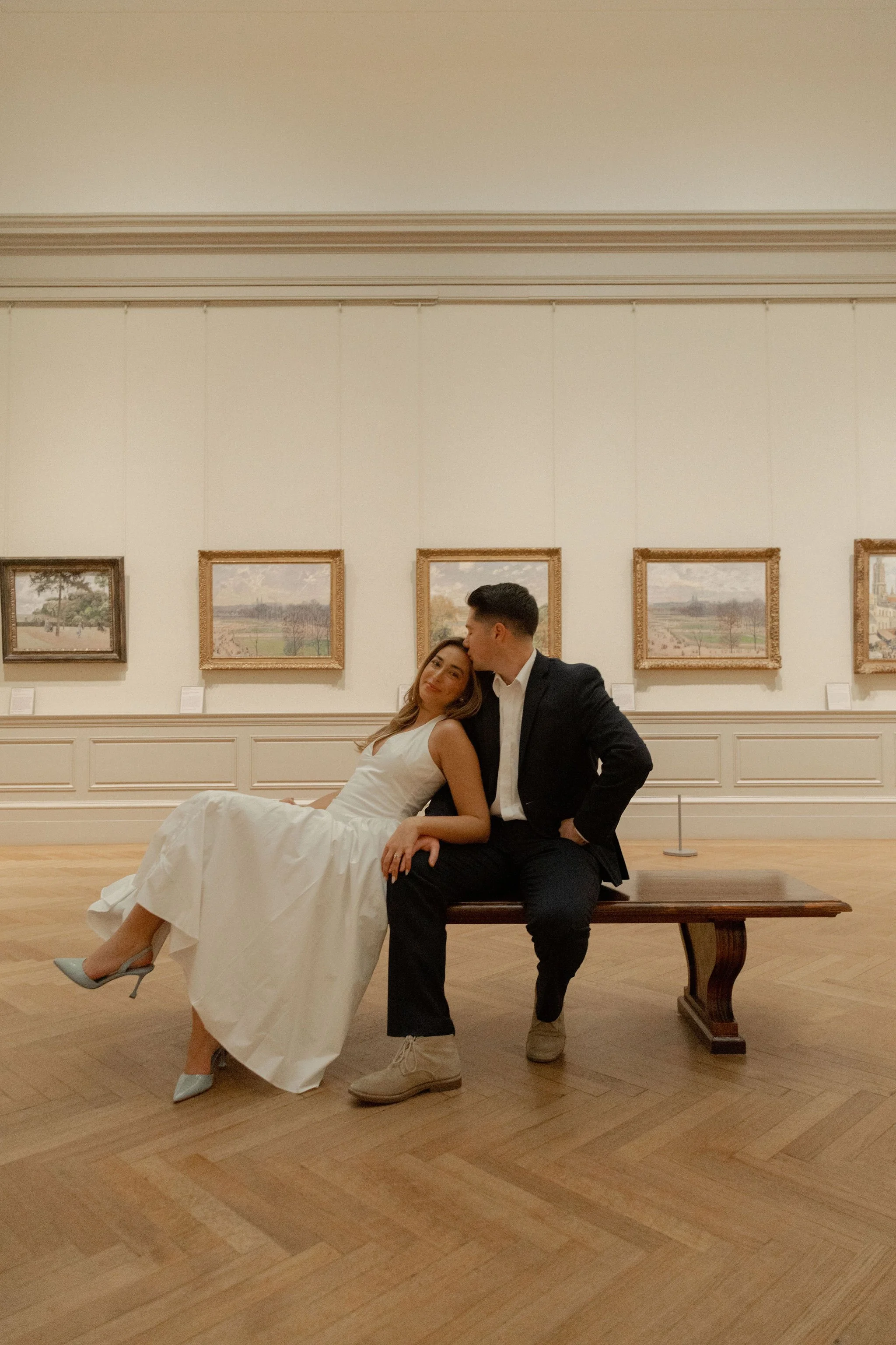 A couple sits on a wooden bench in an art gallery. The woman is wearing a white dress and blue high heels, leaning on the man's shoulder. The man is dressed in a dark suit and tan shoes, with his arm around her. Behind them are several framed paintin