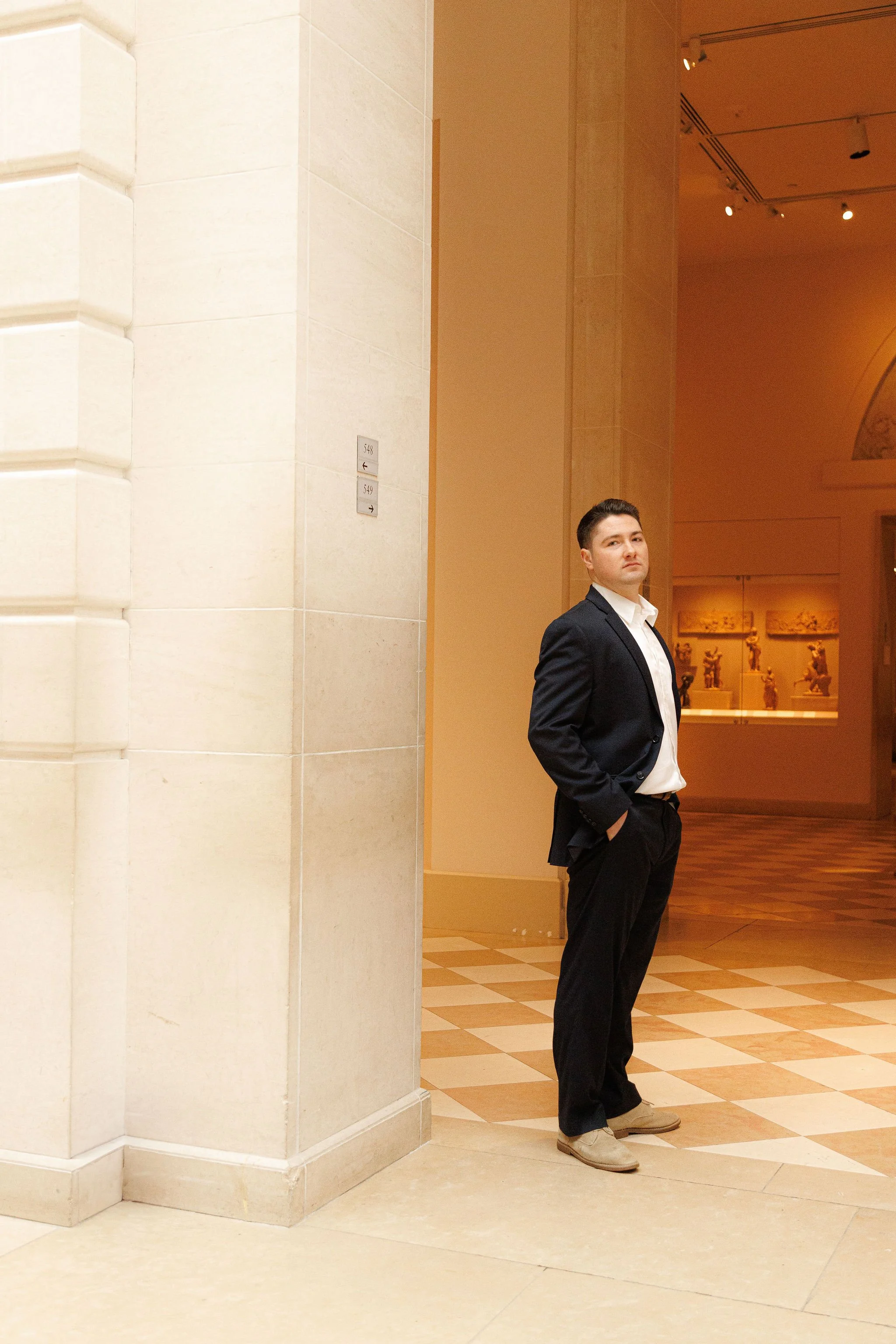 Man in a suit standing in a hallway with artwork displayed in the background.