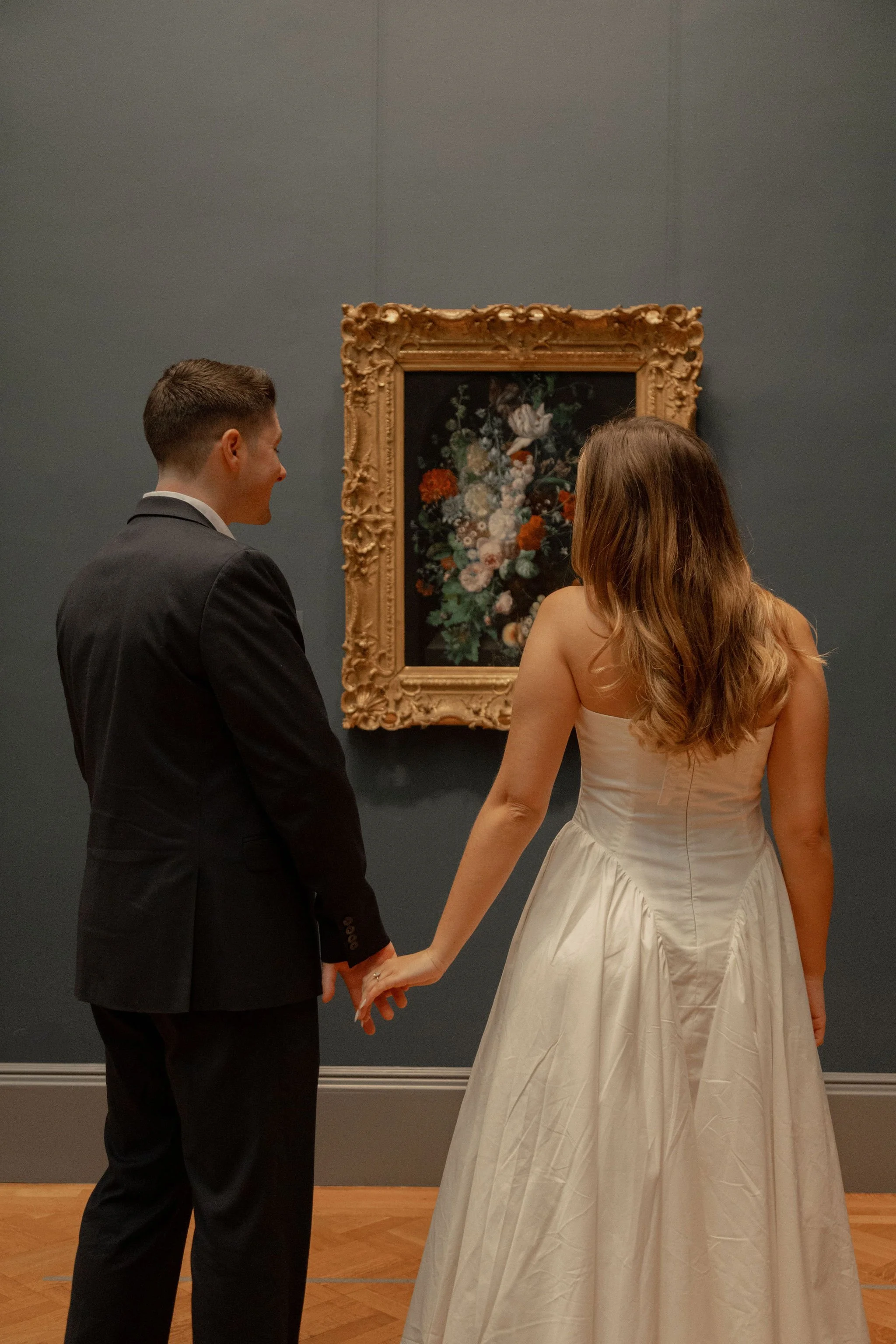 A couple holding hands and looking at a framed artwork in a gallery. The man is wearing a dark suit, and the woman is in a white dress.