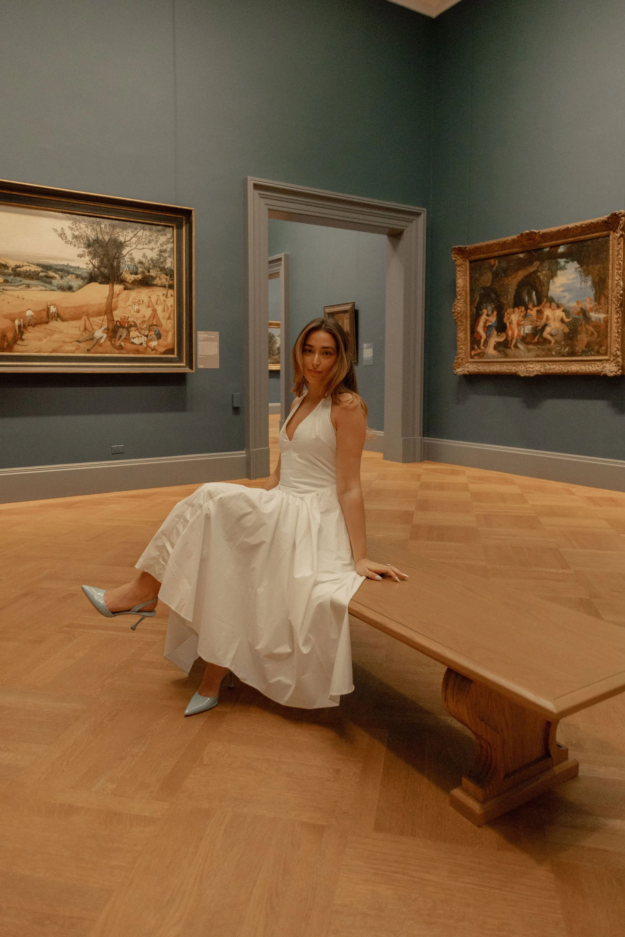 Woman in a white dress sitting on a wooden bench in an art gallery with paintings on the walls.