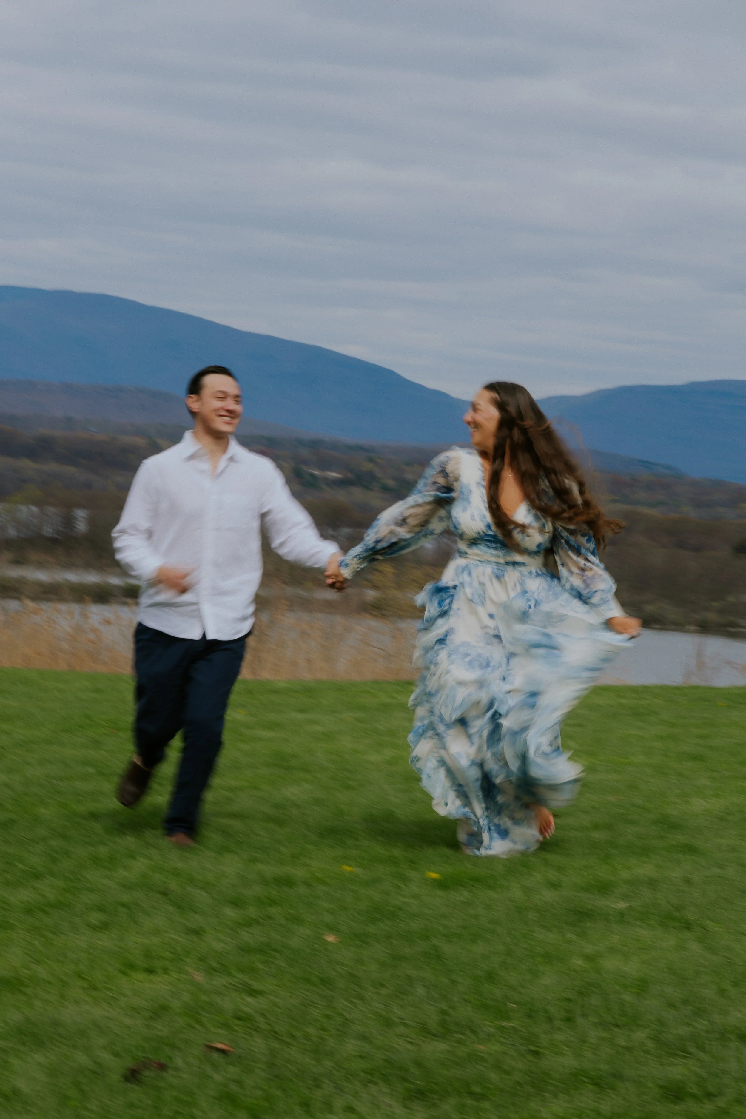 A couple holding hands and running on green grass with mountains and a lake in the background.