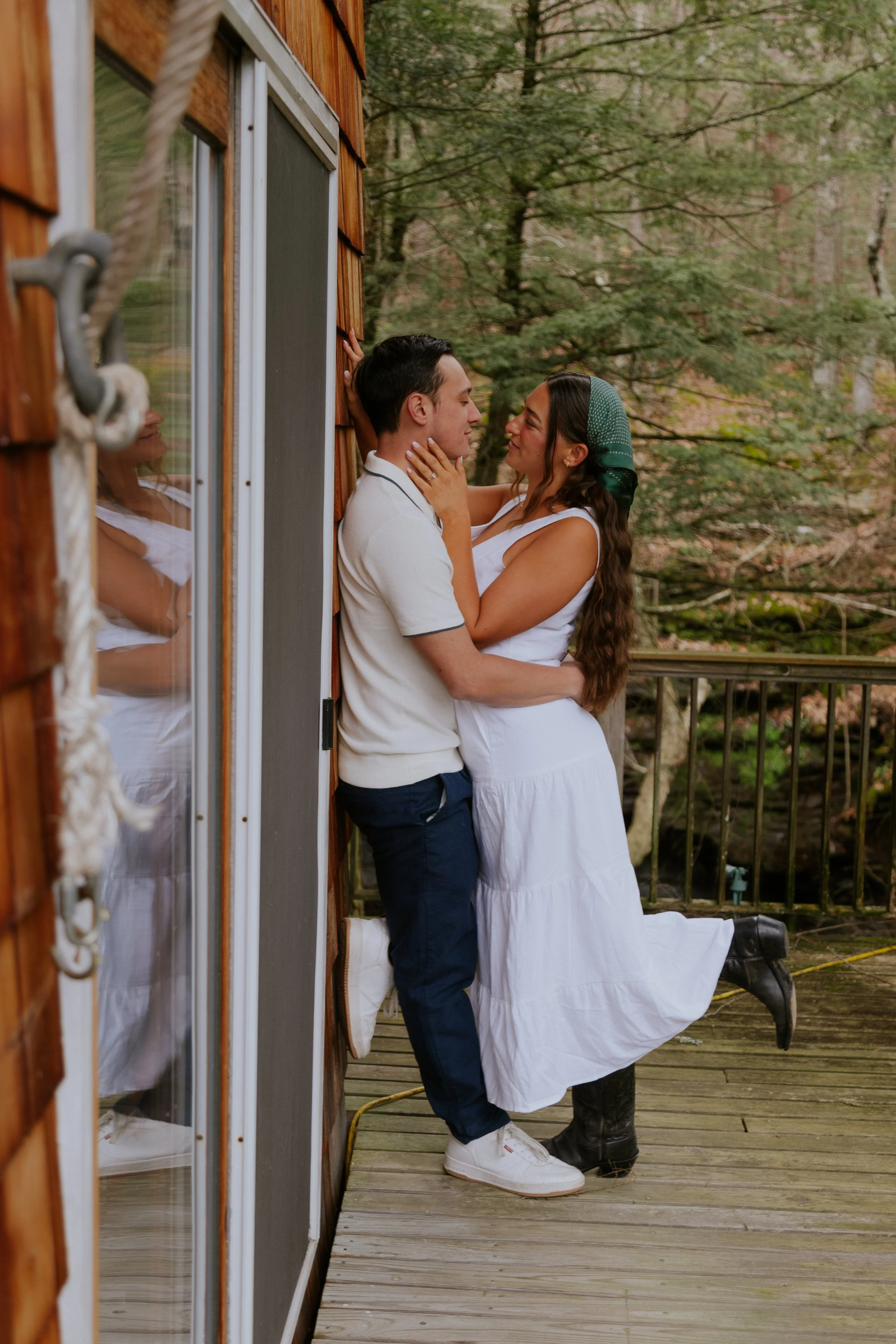 Couple embracing on a wooden deck next to a cabin, with trees in the background.