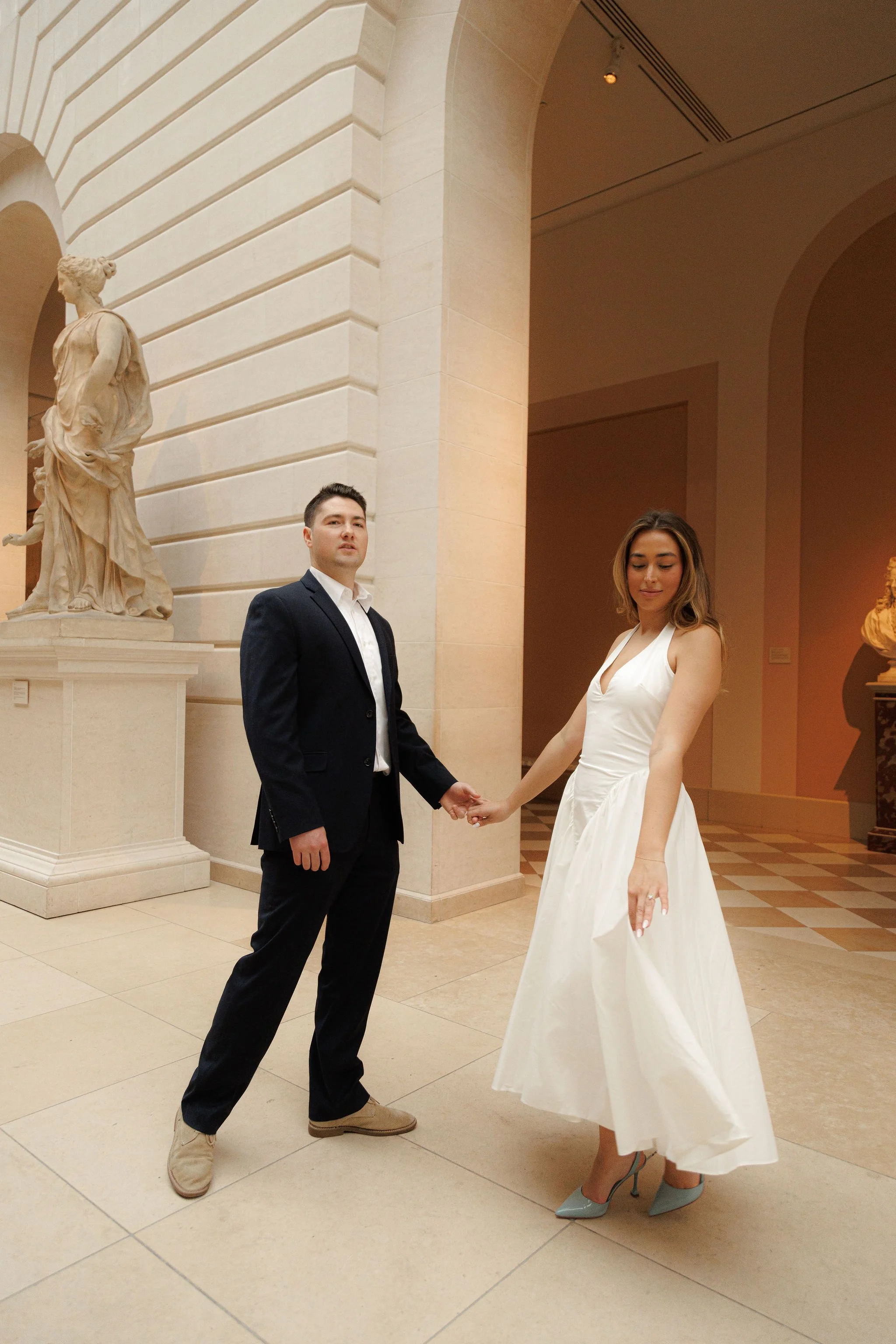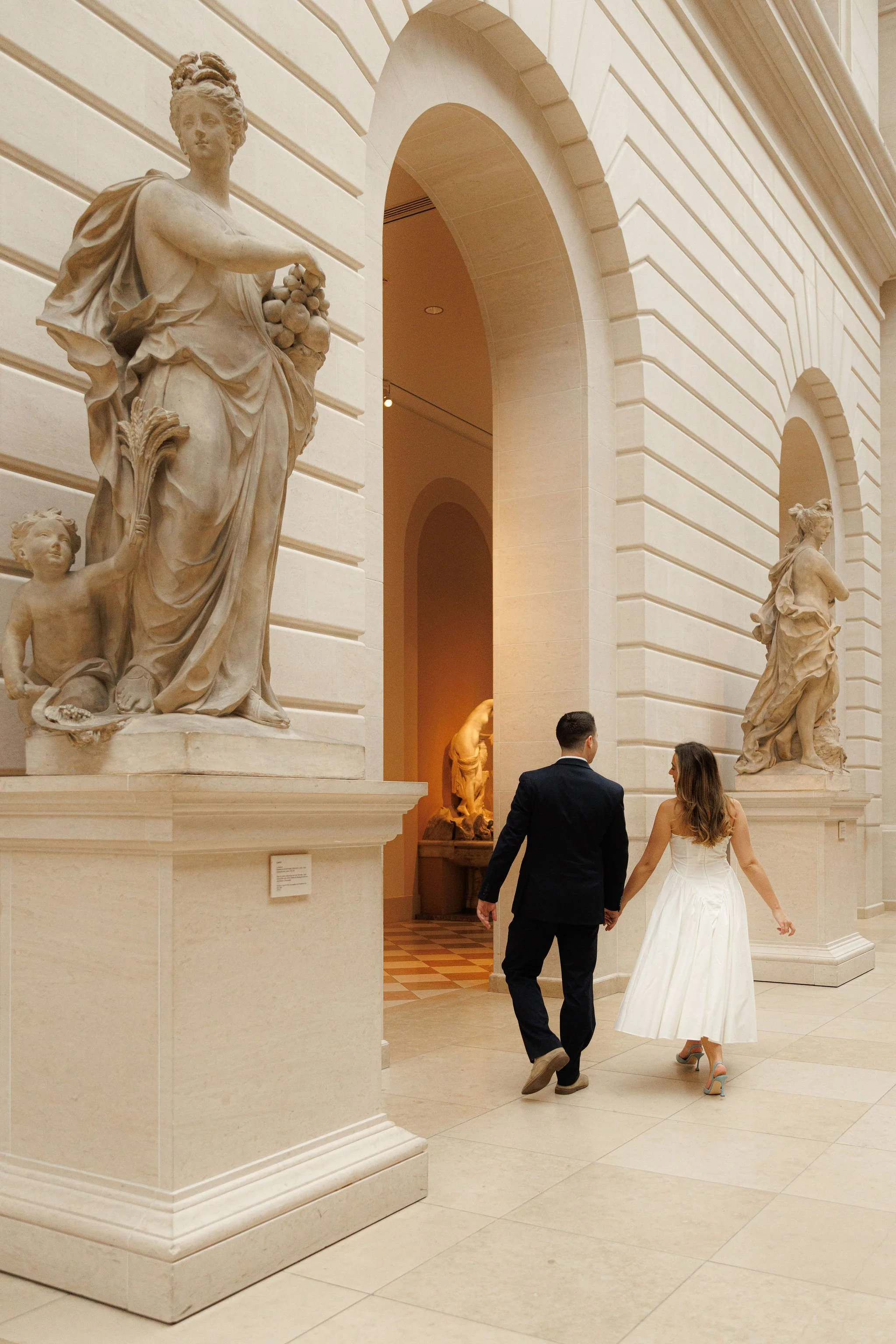 A couple in formal attire holding hands, walking through a museum or art gallery with large classical sculptures and arches.