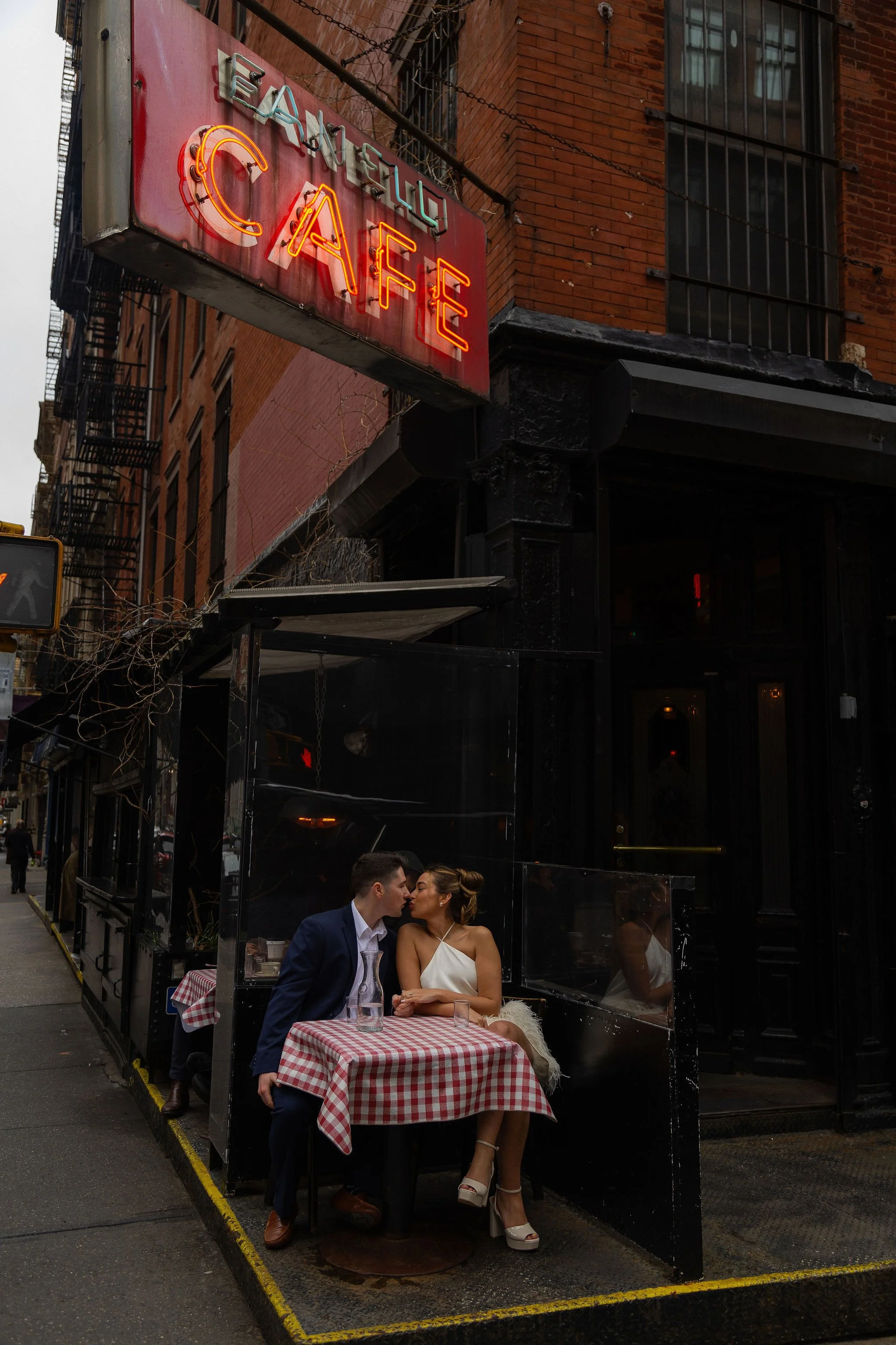Couple kissing at a small outdoor table with red and white checkered tablecloth under a neon cafe sign.
